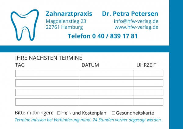 Die Terminzettel sind im Querformat angelegt und sind für die Vergabe von bis zu 4 Terminen vorgesehen. Sie können das Layout in verschiedenen Schriften, Farben selbst gestalten. In der oberen Ecke ist ein Zahn in weiß abgebildet. Natürlich können SIe auch Ihr eigenes Logo verwenden.