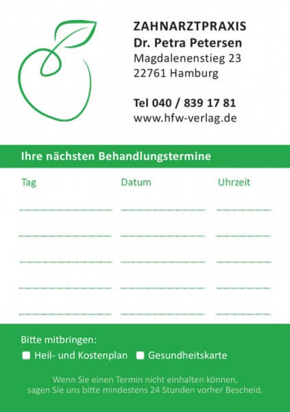 Die Terminzettel sind im Hochformat angelegt und sind für die Vergabe von bis zu 5 Terminen vorgesehen. Sie können das Layout in verschiedenen Schriften, Farben selbst gestalten. In der oberen Ecke ist ein Zahn in weiß abgebildet. Natürlich können SIe auch Ihr eigenes Logo verwenden.